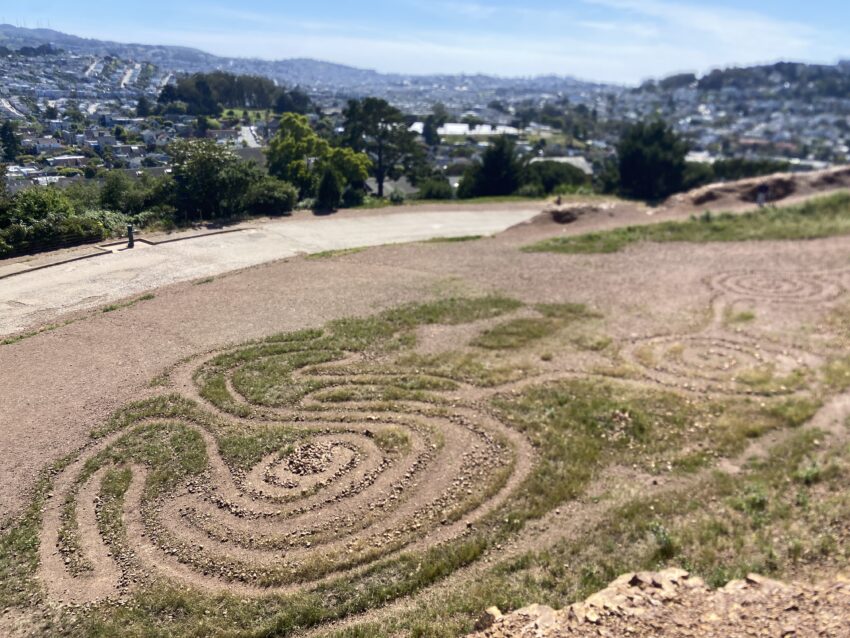 I think I’ve finished touring all of the public labyrinths in San Francisco! The last one I could find is in beautiful Bernal Heights Park. It’s right near the road so it’s easy to spot. And it’s one of the most original designs that I’ve seen, weaving its way around three spirals. It might be…