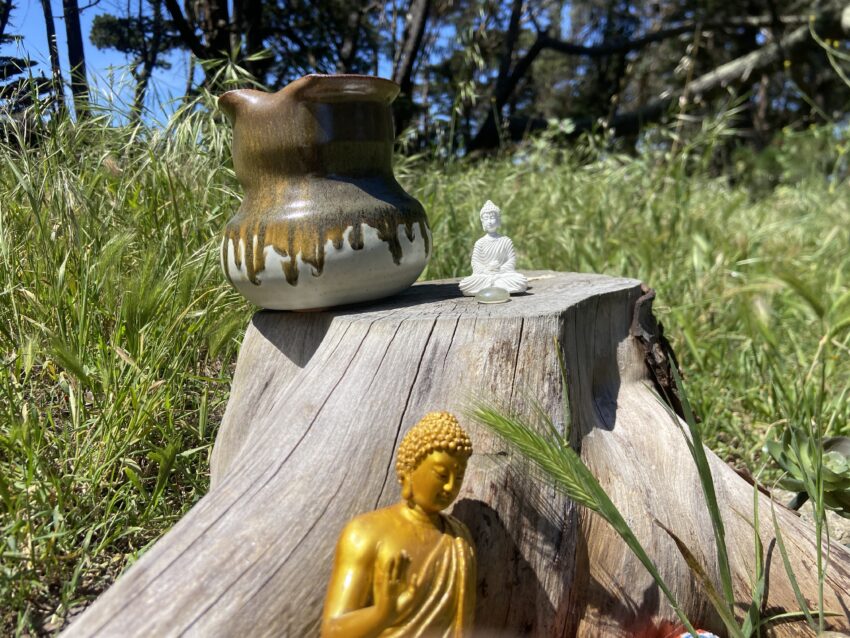 Today I visited the most “rustic” of all the labyrinths I’ve experienced in SF, the McLaren Park labyrinth. Basically it’s just a dirt path barely delineated with some rocks, with weeds and detritus all around it. Random toys and objects are strewn about. The center is an altar of sorts, with a couple of buddha…