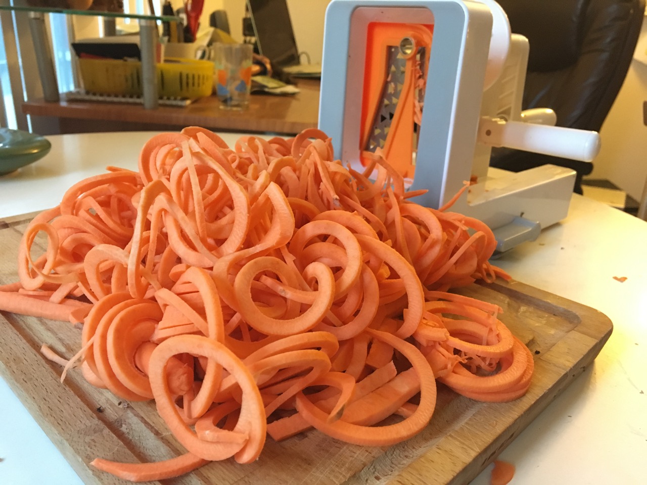 Use your handy spiralizer to make the linguine-sized noodles out of the sweet potatoes. Here’s how mine came out.