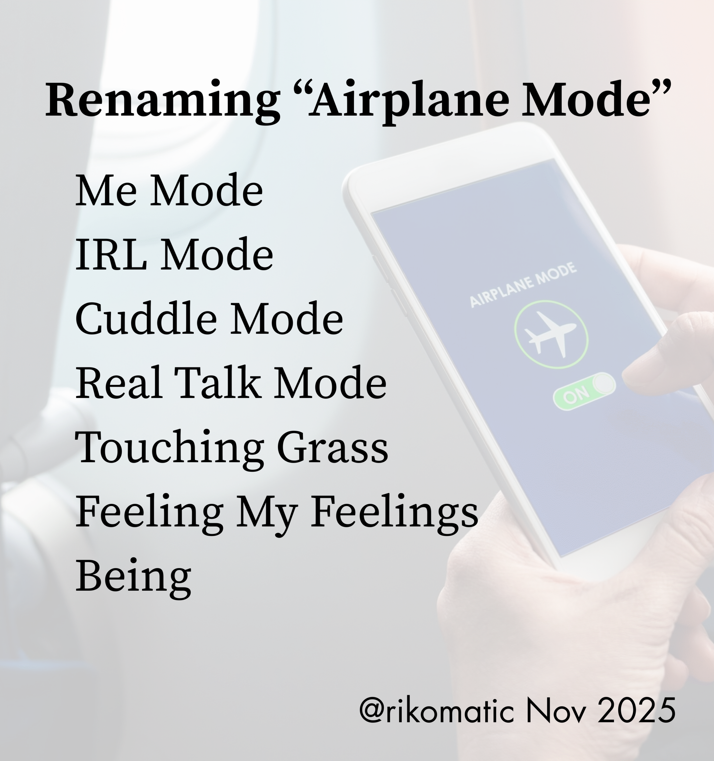 Renaming Airplane Mode Posted on November 15, 2025November 15, 2025 by Renaming Airplane Mode Me ModeIRL ModeCuddle ModeReal Talk ModeTouching GrassFeeling My FeelingsBeing