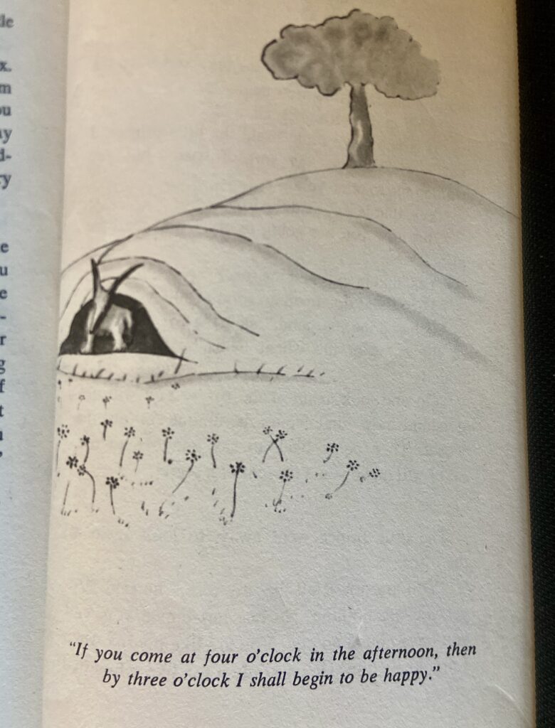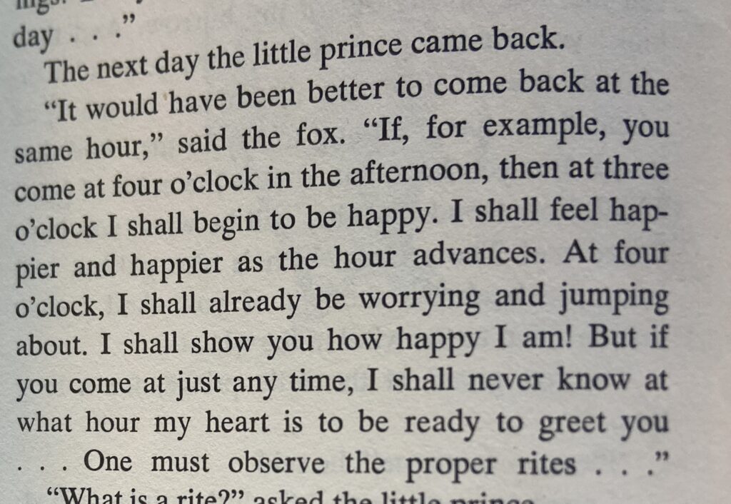 “It would have been better to come back at the same hour,” said the fox. “If, for example, you come at four o’clock in the afternoon, then at three ơ’clock I shall begin to be happy. I shall feel happier and happier as the hour advances. At four o’clock, I shall already be worrying and jumping about. I shall show you how happy I am! But if you come at just any time, I shall never know at what hour my heart is to be ready to greet you… One must observe the proper rites….”